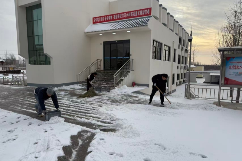 皂河站党支部、滞洪闸所党支部组织“除雪突击队”,对管理范围内的道路、机房周边、供水管道等关键区域开展集中除雪作业。“大家把积雪往两边清,注意脚下防滑!”党员们冲锋在前,手持铁锹、扫帚等工具,弯腰铲雪、挥帚清冰,有的负责铲除站区主干道的积雪,有的专注清理机房周边和设备区域的残留冰渣,有的在办公楼、厂房入口、作业通道等重点地段铺设防滑垫、撒布融雪剂,在党员的带动下,全站职工迅速凝聚起攻坚合力,仅用半天时间就完成了站区主要道路和关键区域的除雪任务,确保了人员通行和作业安全。