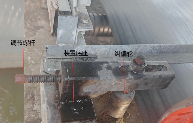 针对传统方法的不足,技术人员转变思路,由“间接校正”改为“直接干预”,在输送机上增设可调节辅助纠偏轮。制作2套辅助纠偏装置,安装在皮带下端及电动辊筒、转向辊筒出口等关键位置,每套装置包含左右2只可前后调节的纠偏轮,直接固定在输送机支架上。当皮带跑偏时,只需调节相应侧纠偏轮,使其对皮带侧面施加横向推力,即可迅速将皮带“扶回”正轨,实现精准导向。