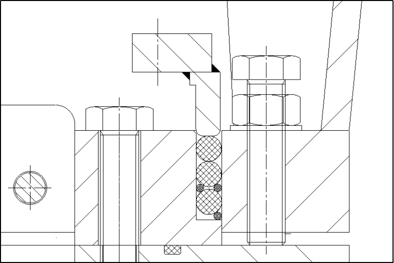 泗阳二站主机组底座压环处采用两道Φ20丁腈橡胶实心圆条和聚四氟乙烯填料进行止水密封,并采用玻璃胶填充封堵空隙,是较为常用的结构设计。其密封原理为挤压型密封,当拧紧压环螺栓时,橡胶圆条受到压环挤压,会产生弹性变形,从而在密封接触面上产生接触压力,当接触压力大于被密封介质的压力时,就不会发生泄漏。拆解座环后,检修人员仔细检查了密封圈和填料部位,发现两道Φ20丁腈橡胶实心圆条嵌入聚四氟乙烯填料中,但形变量不明显,确定了起密封作用的主要是聚四氟乙烯填料。