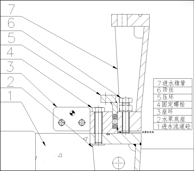 为彻底解决渗水问题,泗阳所集中技术力量进行攻关,逐渐查明了故障原因:泗阳二站加固改造工程对进水流道进行优化,更换了水泵底座,由于建筑物部分沉降,导致水泵座环与进水锥管四周的密封槽间隙不均,流道内的水极易从间隙较大的部位渗出。在安装时填充玻璃胶封堵填料与密封条之间的间隙,机组运行一段时间后,由于玻璃胶固化,加之机组运行振动,固化的玻璃胶与进水椎管部件间产生间隙,此时再压紧压环,对固化的玻璃胶作用不明显,因此渗水情况仍无法得到有效改善。