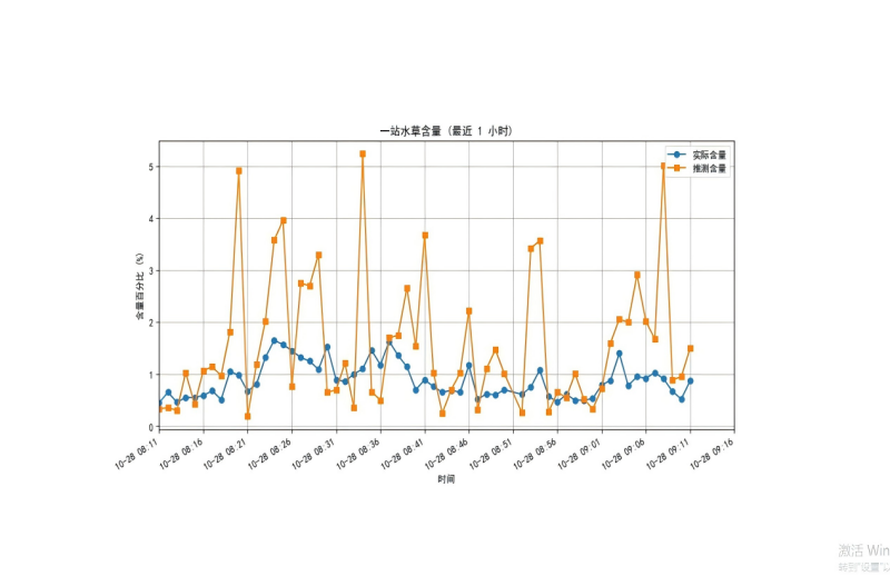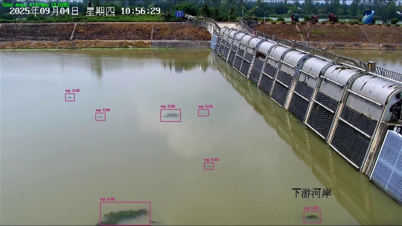 通过对单个画面水草框的面积之和,计算占整体画面的百分比,可实时分析河道水草含量,占比低于5%属于较低含草量,可按正常频率清理水草;若超过20%,属于严重情况,需立即清理。当水草随水流逐渐依附到拦污栅上时,会从画面中消失,因此需要预估附着在拦污栅上的水草量,目前采用的计算方案为:按固定时间间隔(如每分钟一次)的瞬时水草含量,累加估算出水草总量,通过计算出的百分比与阈值比较,判断是否需要预警。