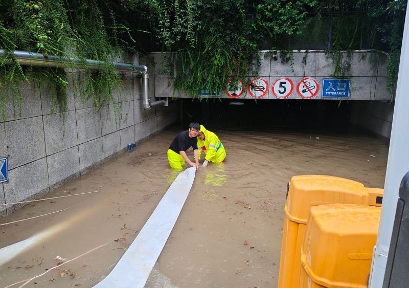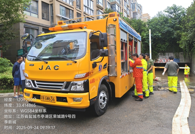 9月23日下午,抢险队伍再次启程,抵达盐城后严阵以待。24日清晨,市区出现内涝险情,抢险队闻令而动、冲锋在前:一路队员驾驶电源泵车迅速赶往市政府区域执行排涝任务,高效架设三台变频泵,以每小时1200立方米的强大抽排能力快速开展作业;与此同时,另一路队员驾驶电源泵车紧急驰援四季新城小区,对积水严重的地下车库进行抽水排涝,同样架设两台变频泵(抽水能力1200立方米/小时)全力抽排。至当日11时30分,市政府点位险情得到有效控制,电源泵车转入待命状态;四季新城小区的排涝作业则仍在持续攻坚推进中。
